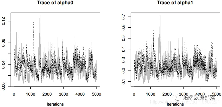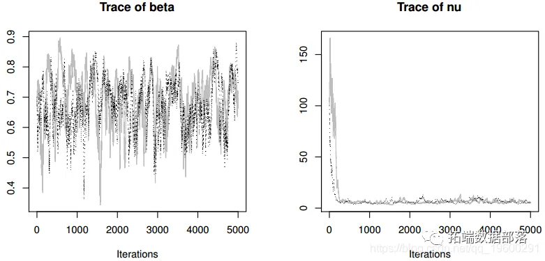作为贝叶斯估计的先验分布。通过设置控制参数值n.chain = 2和l.chain = 5000,我们为5000次传递生成了两条链。