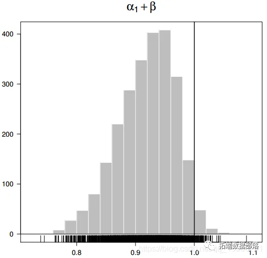 为了推断平方过程的持久性,我们仅使用后验样本,并为后验样本中的每个绘制y [j]生成(a1 [j] + b [j])。持久性的后部密度绘制在图4中。直方图向左倾斜,中值为0.923,最大值为1.050。假设a1 + b <1,则GARCH(1,1)模型的无条件方差为a0 /(1- a1- b)。条件是存在时,后验均值为0.387,90%可信区间为[0.274,1.378 ]。经验方差为0.323。
