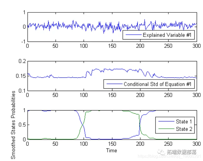 马尔可夫区制转换(Markov regime switching)模型旨在阐明这些类型的问题。它将以上收益序列视为 由马尔可夫过程控制的 状态(区制)切换模型(MRS),以在状态之间进行切换。代码: