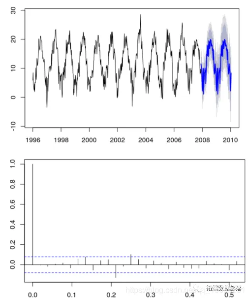 ARIMA = arima (z, order =c(1 ,0 ,0 ,seasonal =list ( order =c(0 ,1 ,0 ,period =52 plot ( forecast (ARIMA ,h =112 )