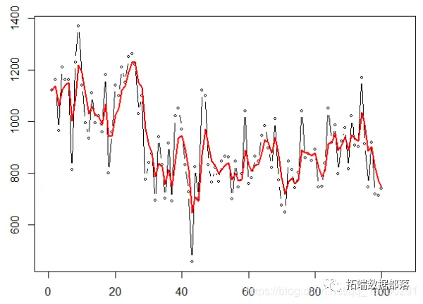 plot (X, type ="b",cex =.6 lines ( SimpleSmooth ( HWtau (.8,col=" blue ", lwd =2)