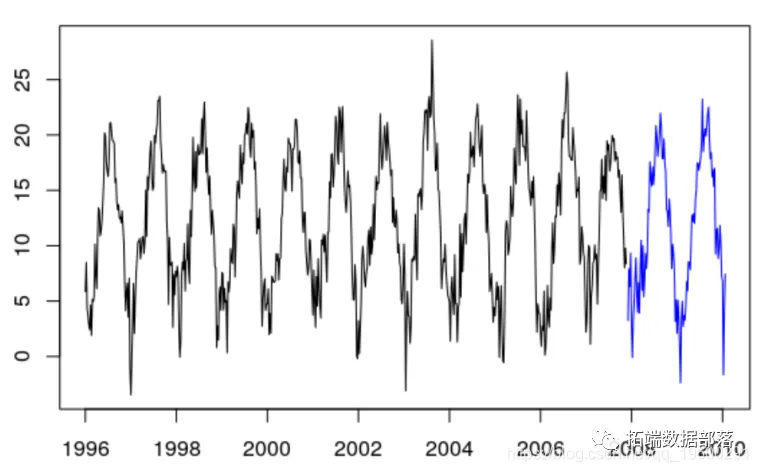 plot (ts( data = Temp , start = 1996 , frequency = 52) , lines (ts( data = train $Temp , start = 1996 , frequency = 52) ) lines (ts( data = test $Temp , start = 1996+620 /52, frequency = 52)