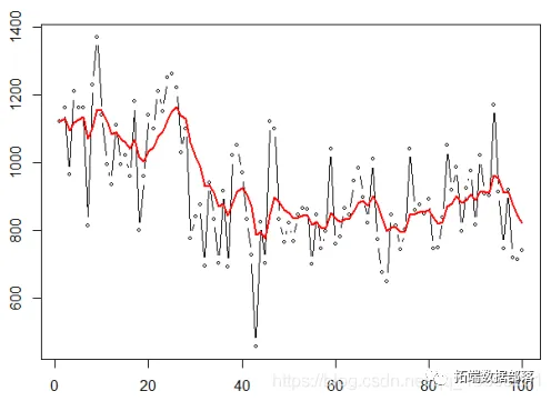 X=as. numeric ( Nile ) SimpleSmooth = function (a){ for (t in 2:T{L[t=a*X[t+(1 -a)*L[t -1 }lines ( SimpleSmooth (.2) ,col =" red ")