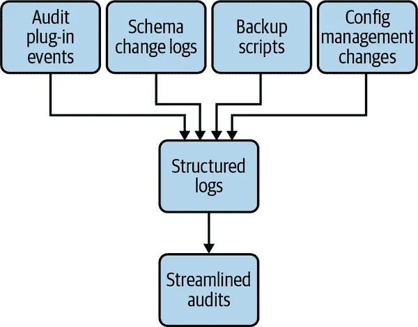 这里的目标是避免年度审计成为一个重大干扰事件,团队在为审计团队收集证据而忙碌。相反,如果您对这些正常业务操作的工作方式进行一些更改,您可以获得“内置”证据,这样收集和用于审计的证据就会简单得多。您将在本节中看到一个关于从所有方面生成结构化日志的重复主题。这是有意的。这在很大程度上有助于以相同方式跟踪各种变更,这种一致性有助于企业以更少的干扰实现其审计需求。您可以看到这一切是如何在图 13-1 中结合在一起的。