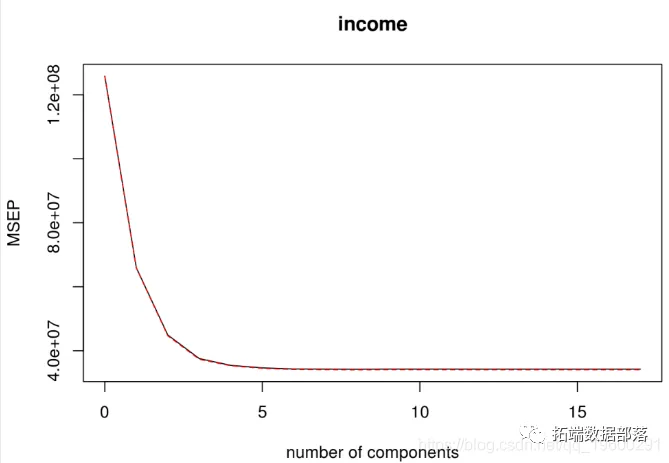 输出包括“验证”部分中均方根误差 。因为有17个独立变量,所以有17个成分。可以看到,在成分3或4之后,因变量中解释的方差几乎没有改善。下面是这些结果图的代码。