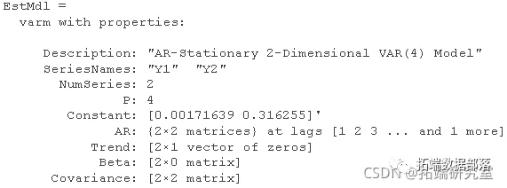 Mdl 是一个 varm 模型对象。它包含一个序列、一个未知常数和一个未知方差。模型的属性出现在命令行中。