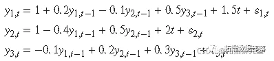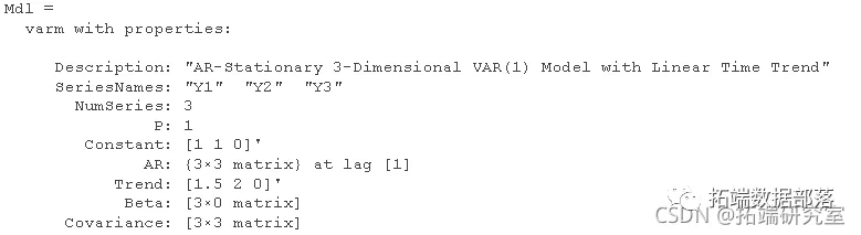 varm 对象的关键组成部分 包括时间序列的数量和多元自回归多项式 ( p )的阶数,因为它们完全指定了模型结构。其他模型组件包括将相同的外生预测变量与每个序列相关联的回归成分,以及常数和时间趋势项。