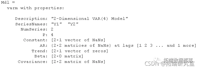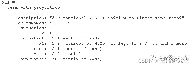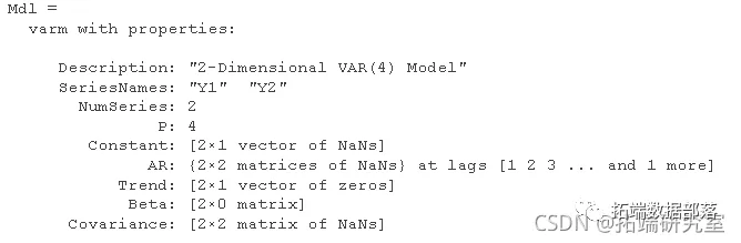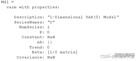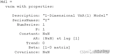 Mdl 是一个 var 模型对象。所有包含NaN 值的属性都 对应于给定数据要估计的参数。