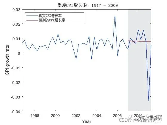创建并估计 CPI 增长率和失业率的 VAR(4) 模型。将最后十个时期视为预测范围。