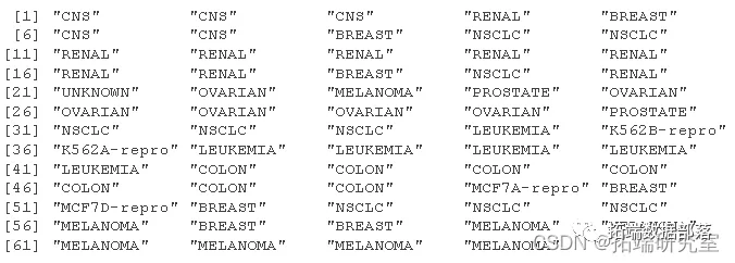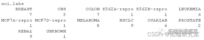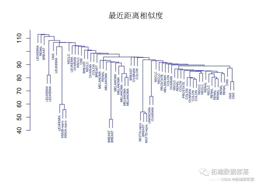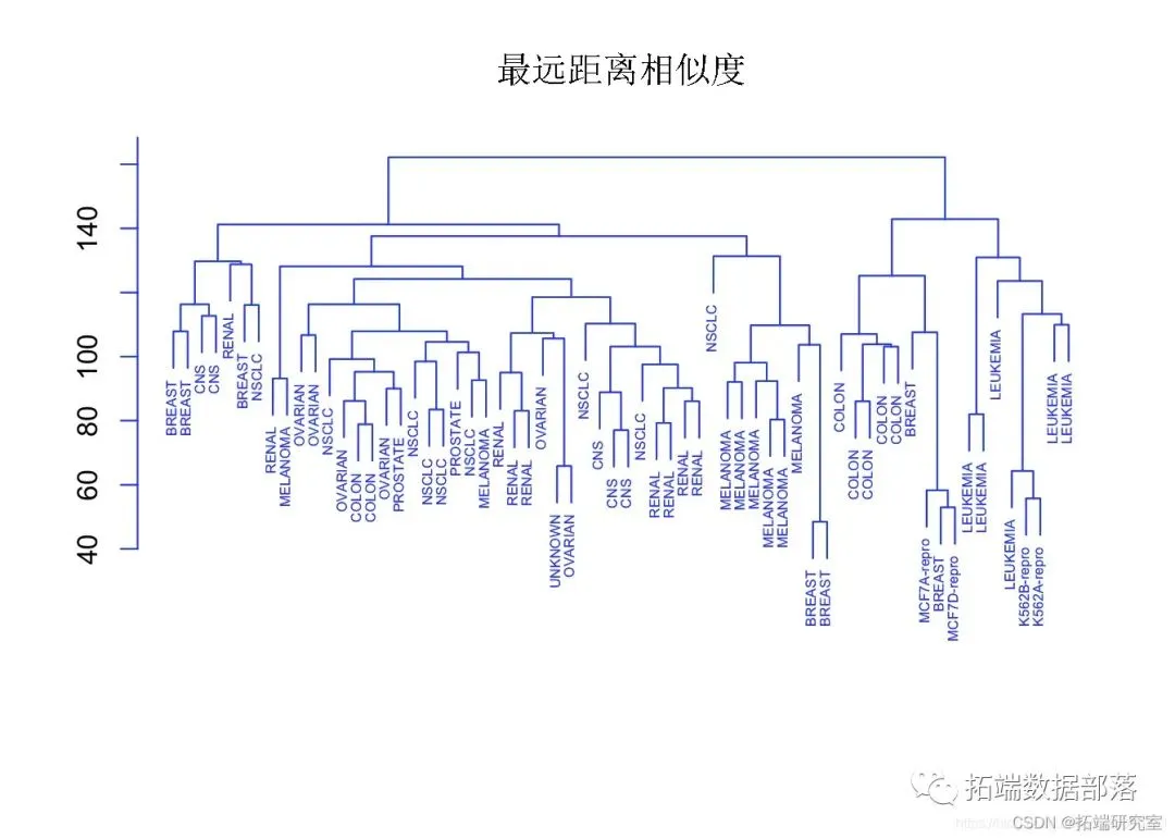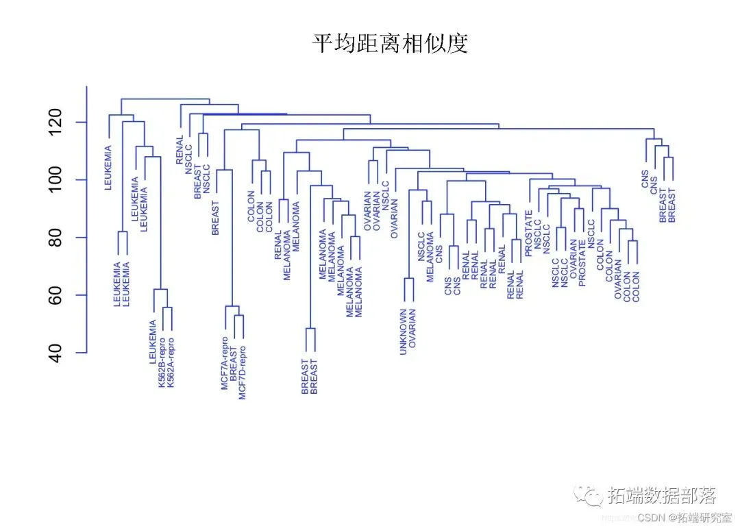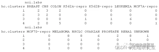 我们可以看到一个清晰的模式,即所有白血病细胞系都属于聚类 3,其中乳腺癌细胞分布在三个不同的聚类中。