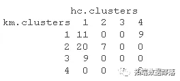 我们看到,获得层次聚类和 K-means 聚类的四个聚类产生了不同的结果。K-means 聚类中的簇 2 与层次聚类中的簇 3 相同。另一方面,其他聚类簇不同。