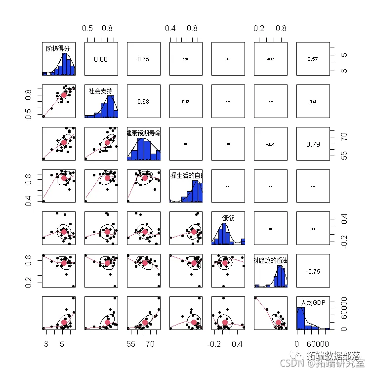 - 人均GDP较高的国家往往对腐败的看法较低,对健康的期望寿命,社会支持和阶梯得分较高。