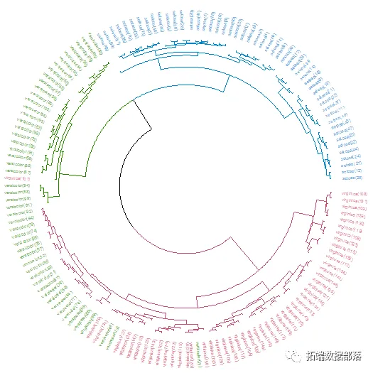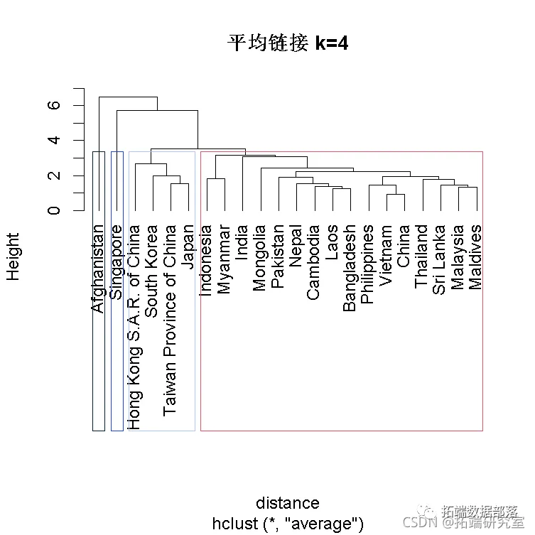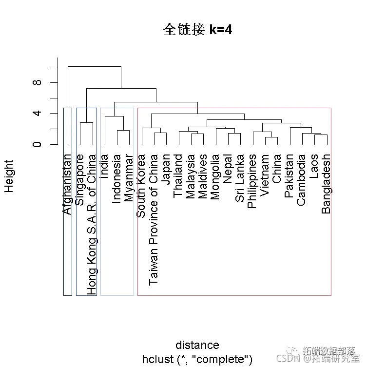 plt(aslus.c,laes=国家名称,min='全链接 k=4', hang=-1) rct.clut(whasi.hclusc, k=4)