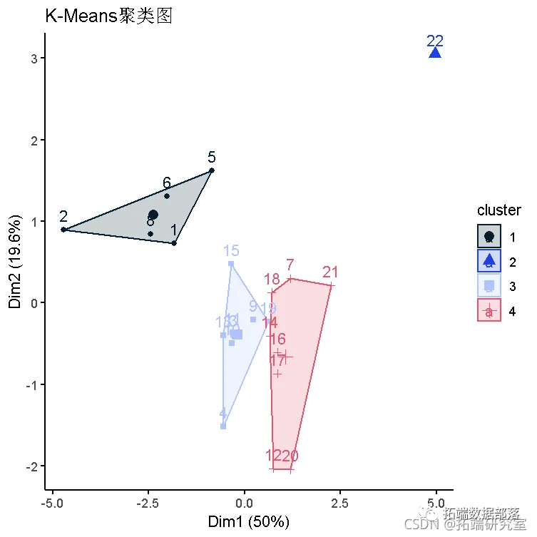 聚类图在散点图中绘制k均值聚类和前两个主成分(维度1和2)。