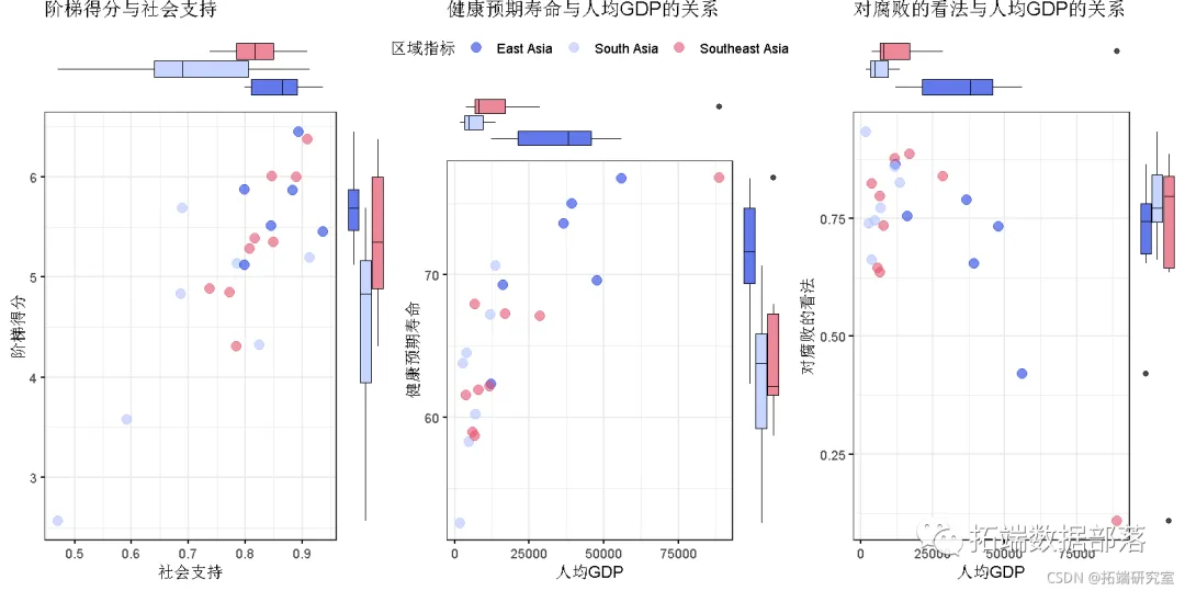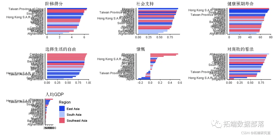 - 东亚国家的阶梯得分较高,期望寿命健康,人均GDP较高且慷慨度较低。