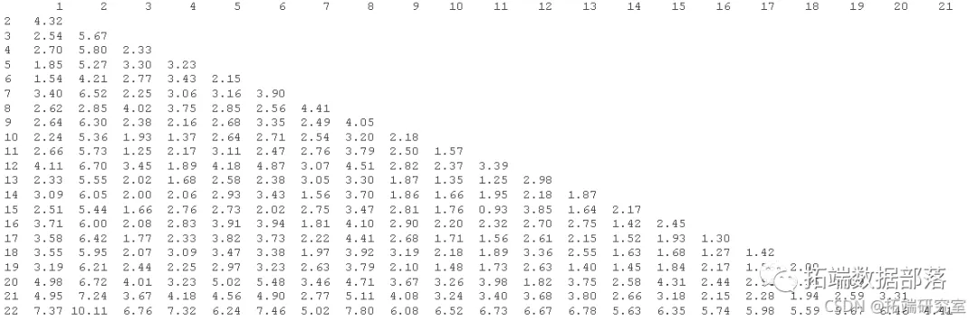 aply(z,2,mean) # 计算列的平均值 aply(z,2,sd) # 计算列的标准差 scale(z,ceter=means,scae=sds) # 标准化 # 计算距离矩阵 dsae = dit(nor) # 计算欧几里得的距离