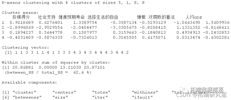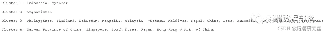 - 聚类1有2个国家,其聚类平方和之内很小(在聚类变异性内)。