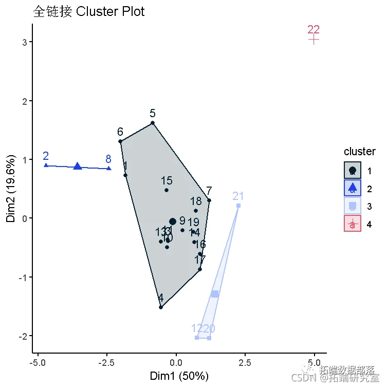 custr(ist(dta = or, cuse = mer.a), ghe = teelsic)) + title("全链接 lusterPlot")