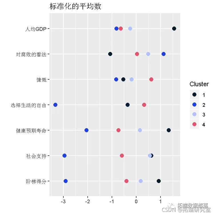 自由选择生活,社会支持和阶梯得分之间的差异很大。这些变量似乎对聚类形成贡献最大。