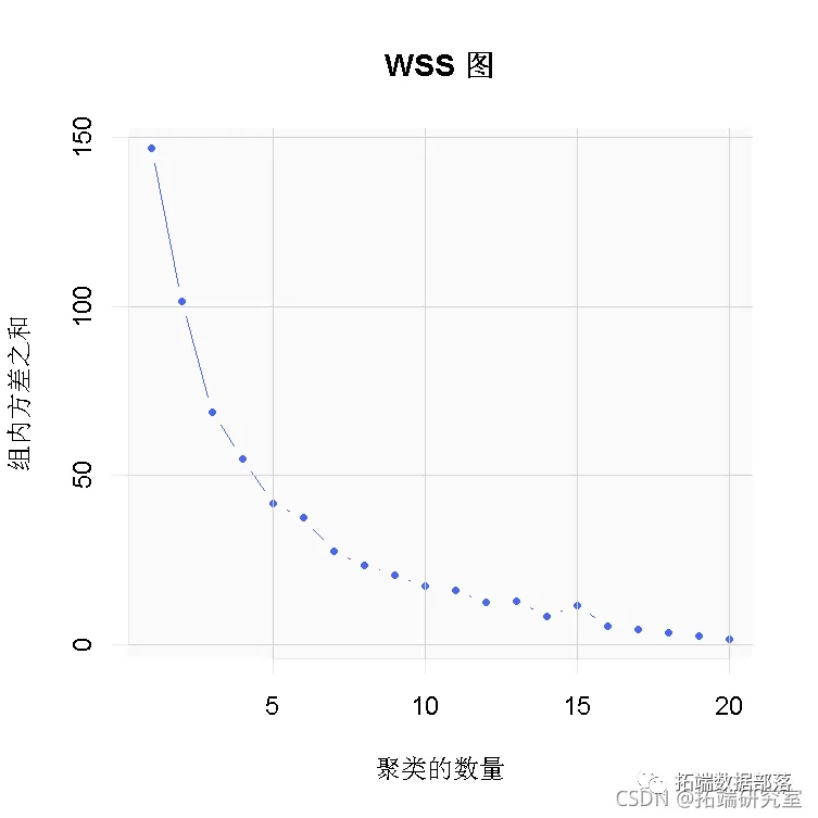 我们的目标是减少聚类内部的变异性,以便将相似的对象分组在一起,并增加聚类之间的变异性,以使相异的对象相距甚远。WSS(在组平方和内),它在聚类变化内进行度量,