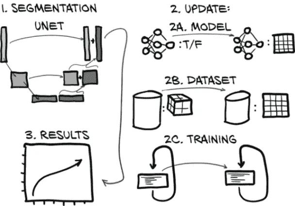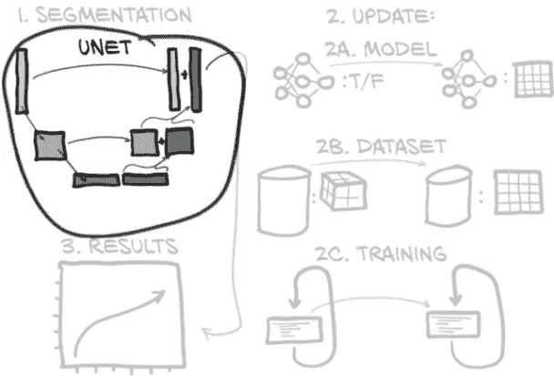 - 更新模型(步骤 2A)。我们将把一个现有的 U-Net 集成到我们的分割模型中。我们在第十二章的模型输出一个简单的真/假分类;而在本章中的模型将输出整个图像。