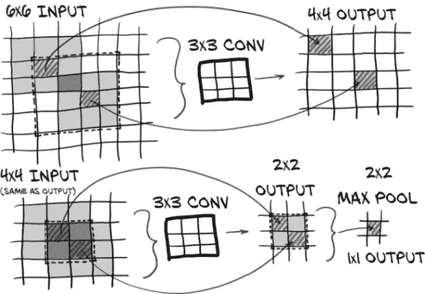 在图中,我们的输入从左到右在顶部行中流动,并在底部行中继续。为了计算出影响右下角单个像素的接受域–我们可以向后推导。最大池操作有 2×2 的输入,产生每个最终输出像素。底部行中的 3×3 卷积在每个方向(包括对角线)查看一个相邻像素,因此导致 2×2 输出的卷积的总接受域为 4×4(带有右侧的“x”字符)。顶部行中的 3×3 卷积然后在每个方向添加一个额外的像素上下文,因此右下角单个输出像素的接受域是顶部左侧输入的 6×6 区域。通过来自最大池的下采样,下一个卷积块的接受域将具有双倍宽度,每次额外的下采样将再次使其加倍,同时缩小输出的大小。