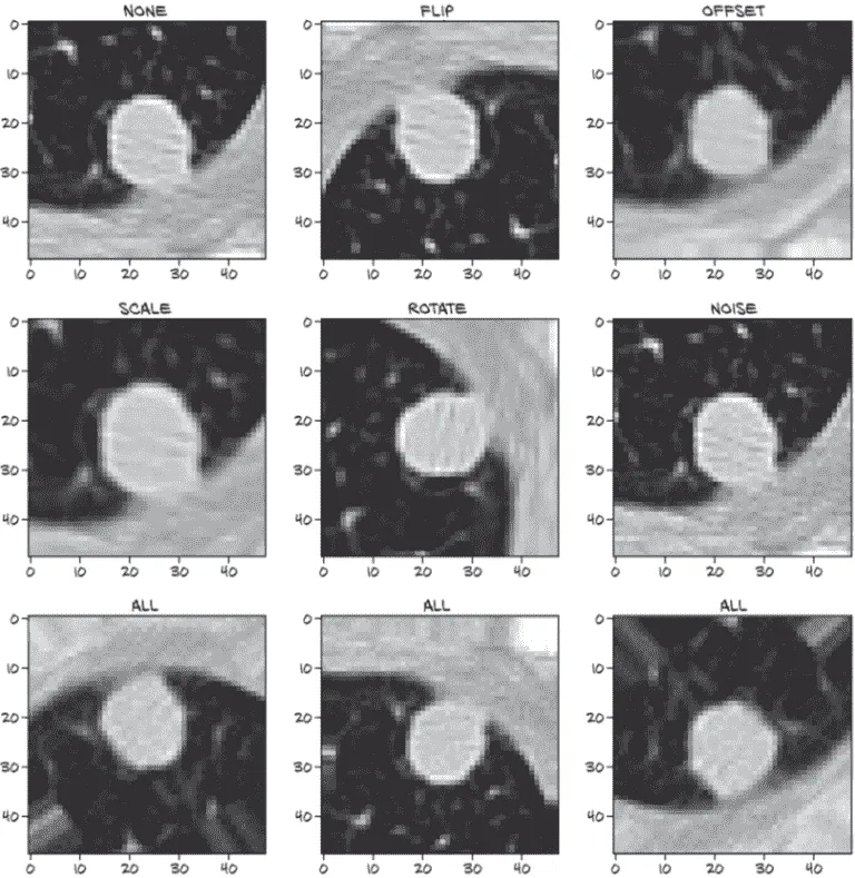将结节候选物体移动一下不会产生很大的影响,因为卷积是独立于平移的,尽管这会使我们的模型对不完全居中的结节更加稳健。更重要的是,偏移量可能不是整数个体素数;相反,数据将使用三线性插值重新采样,这可能会引入一些轻微的模糊。样本边缘的体素将被重复,这可以看作是沿边界的一部分呈现出模糊、条纹状的区域。
