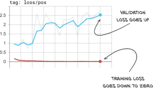 图 12.18 我们的正损失显示出明显的过拟合迹象,因为训练损失和验证损失趋势不同。