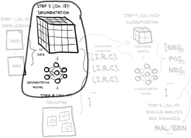图 13.1 我们的端到端肺癌检测项目,重点关注本章主题:第 2 步,分割