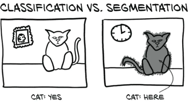 通常,分割用于回答“这张图片中的猫在哪里?”这种问题。显然,大多数猫的图片,如图 13.3,其中有很多非猫的部分;背景中的桌子或墙壁,猫坐在上面的键盘,这种情况。能够说“这个像素是猫的一部分,这个像素是墙壁的一部分”需要基本不同的模型输出和不同的内部结构,与我们迄今为止使用的分类模型完全不同。分类可以告诉我们猫是否存在,而分割将告诉我们在哪里可以找到它。