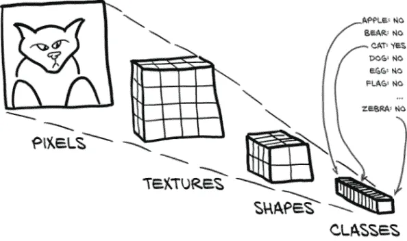 重复的卷积和下采样层意味着模型从消耗原始像素开始,产生特定的、详细的检测器,用于识别纹理和颜色等内容,然后构建出更高级的概念特征检测器,用于眼睛、耳朵、嘴巴和鼻子等部位³,最终得出“猫”与“狗”的结论。由于每个下采样层后卷积的接受域不断增加,这些更高级的检测器可以利用来自输入图像越来越大区域的信息。