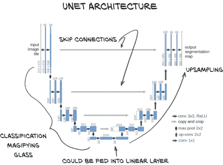 最右侧的“conv 1x1”层位于网络头部,将通道数从 64 改变为 2(原始论文有 2 个输出通道;我们的情况下有 1 个)。这在某种程度上类似于我们在分类网络中使用的全连接层,但是逐像素、逐通道:这是一种将最后一次上采样步骤中使用的滤波器数量转换为所需的输出类别数量的方法。
