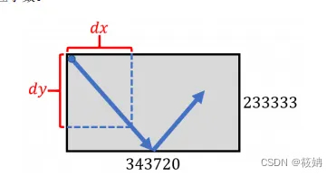 有一长方形,长为 343720 单位长度,宽为 233333 单位长度。在其内部左 上角顶点有一小球(无视其体积),其初速度如图所示且保持运动速率不变,分 解到长宽两个方向上的速率之比为 dx : dy = 15 : 17。小球碰到长方形的边框时 会发生反弹,每次反弹的入射角与反射角相等,因此小球会改变方向且保持速 率不变(如果小球刚好射向角落,则按入射方向原路返回)。从小球出发到其第 一次回到左上角顶点这段时间里,小球运动的路程为多少单位长度?答案四舍 五入保留两位小数。
