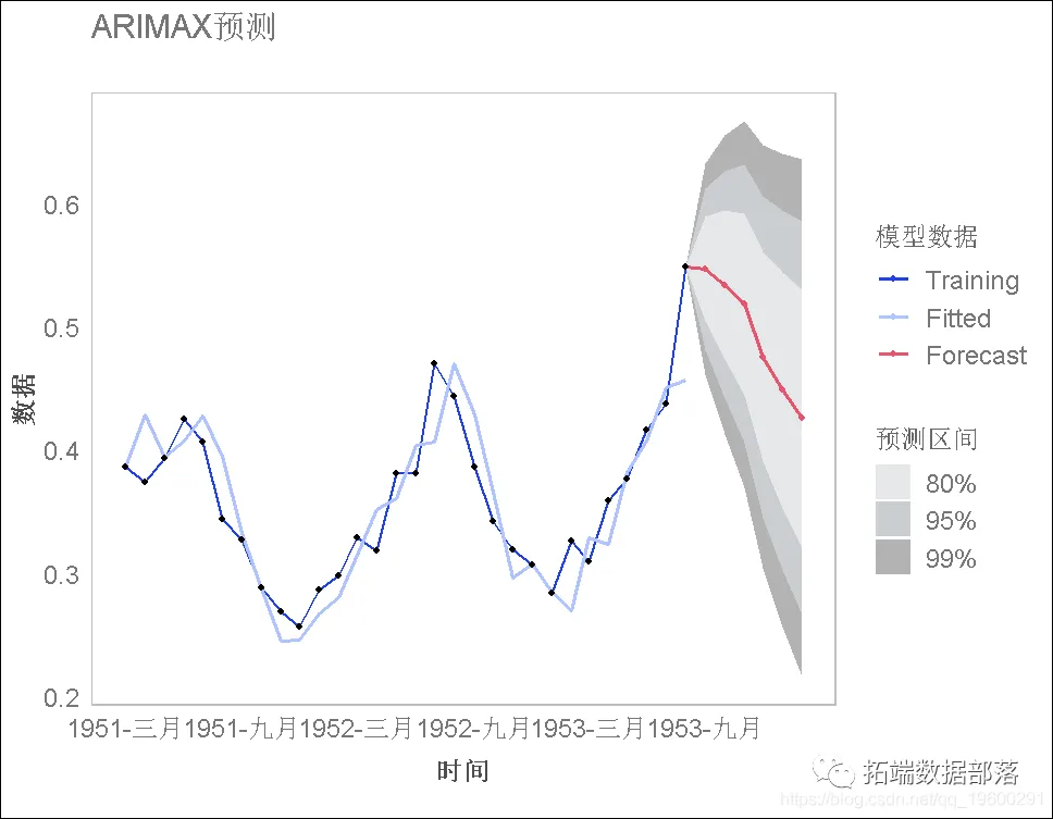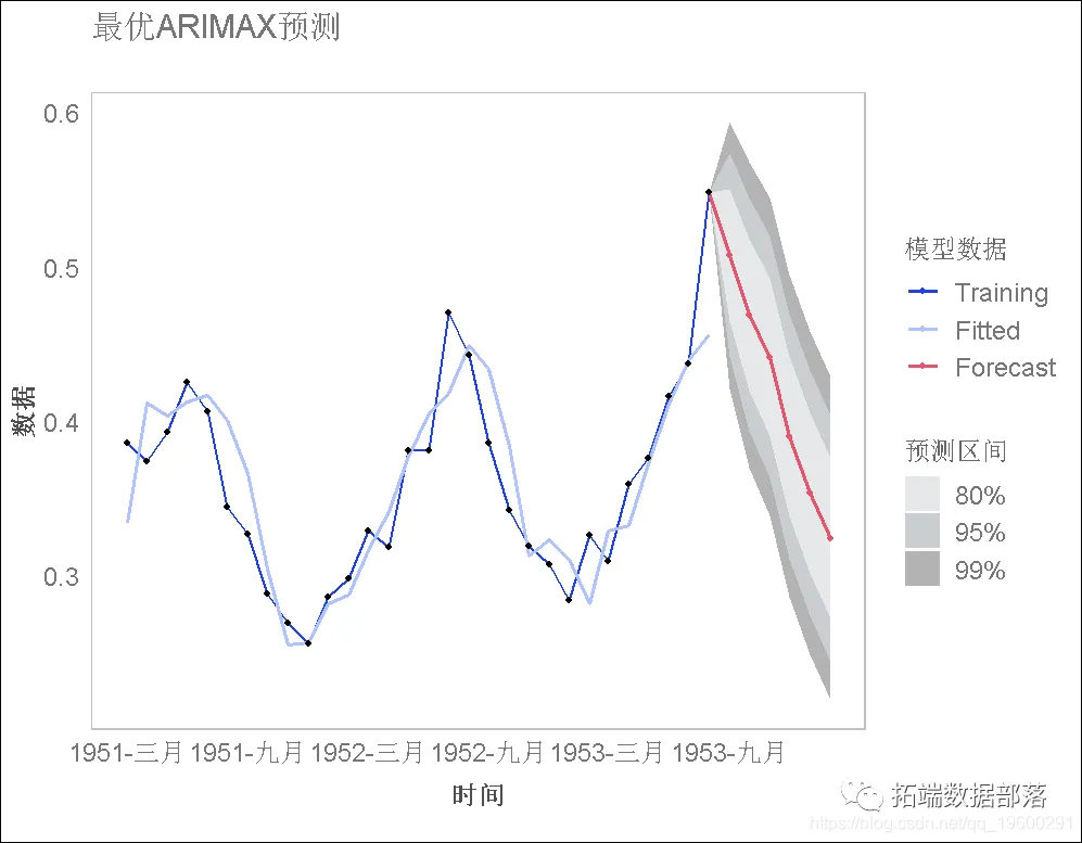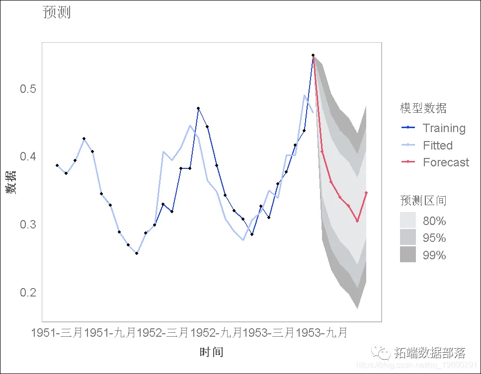 调用包括两个重要元素:data和h。data指定了样本内值在我们要使用的函数中的位置。h将告诉我们的函数,在选定的函数中指定了预测的范围。在这个例子中,我们使用arima(x=data,order=c(0,1,1)),产生了一个想要的ARIMA(0,1,1)模型,然后我们使用predict(...,n. ahead=h),从该模型产生一个预测。