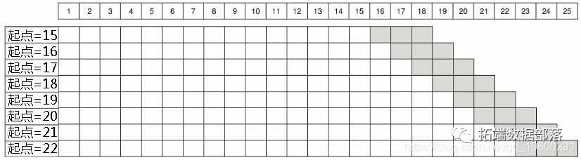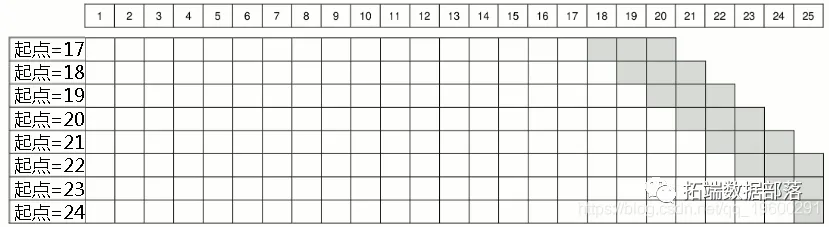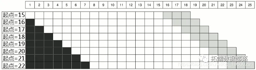 最后,在上述两种情况下,我们的样本量都在增加。然而对于某些研究目的,我们可能需要一个恒定的内样本。下图展示了这样一种情况。在这种情况下,在每次迭代中,我们在系列的末尾增加一个观察值,并从系列的开始删除一个观察值(深灰色单元)。