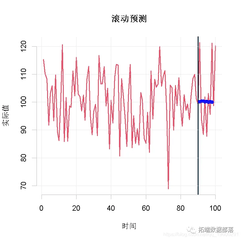 此外,函数predict.lm()返回的是一个带有数值的矩阵,而不是一个列表。最后调用滚动预测。
