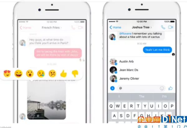 Facebook正在向Messenger添加两个新功能:反应和提及。反应可让用户以各种表情符号回复聊天中的任何个人消息,只需点击并按住即可添加各种表情符号。提及功能可让用户@一个群聊中的某个人,向他们发送消息。