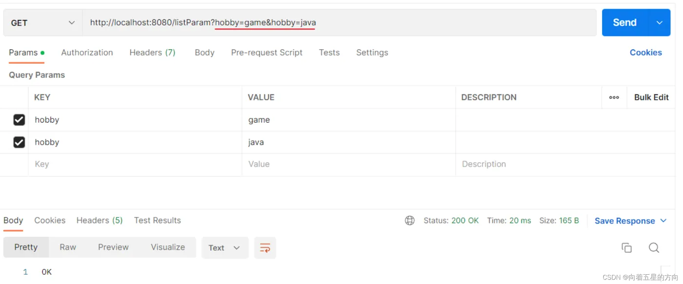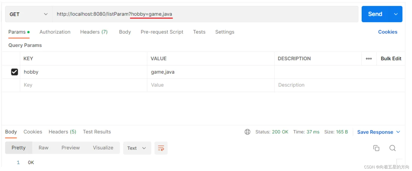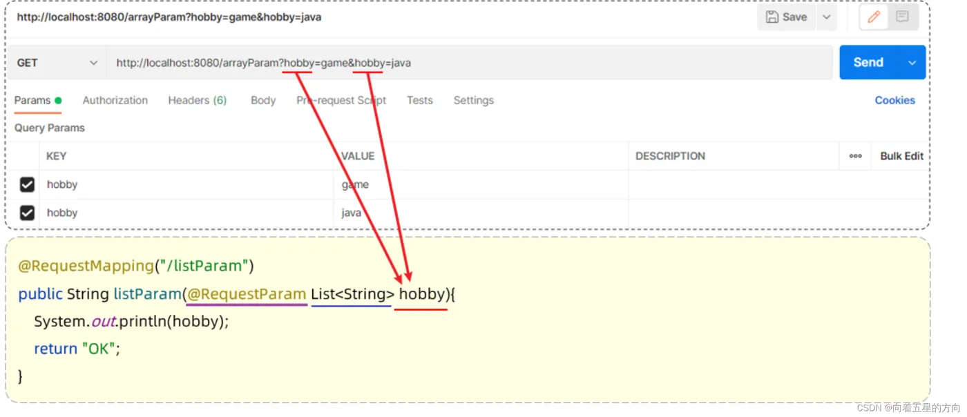 @RestController public class RequestController { //数组集合参数 @RequestMapping("/listParam") public String listParam(@RequestParam List<String> hobby){ System.out.println(hobby); return "OK"; } }