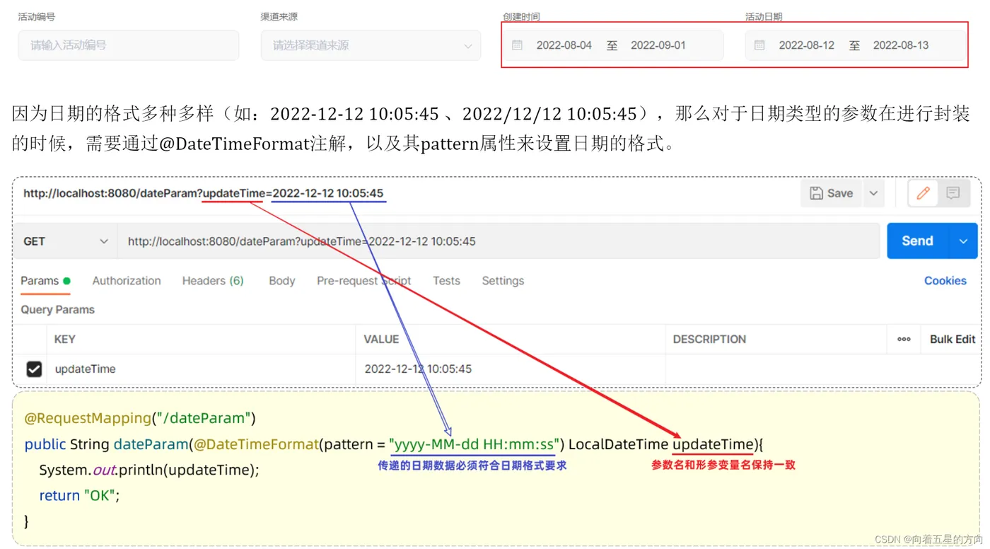 因为日期的格式多种多样(如:2022-12-12 10:05:45 、2022/12/12 10:05:45),那么对于日期类型的参数在进行封装的时候,需要通过@DateTimeFormat注解,以及其pattern属性来设置日期的格式。