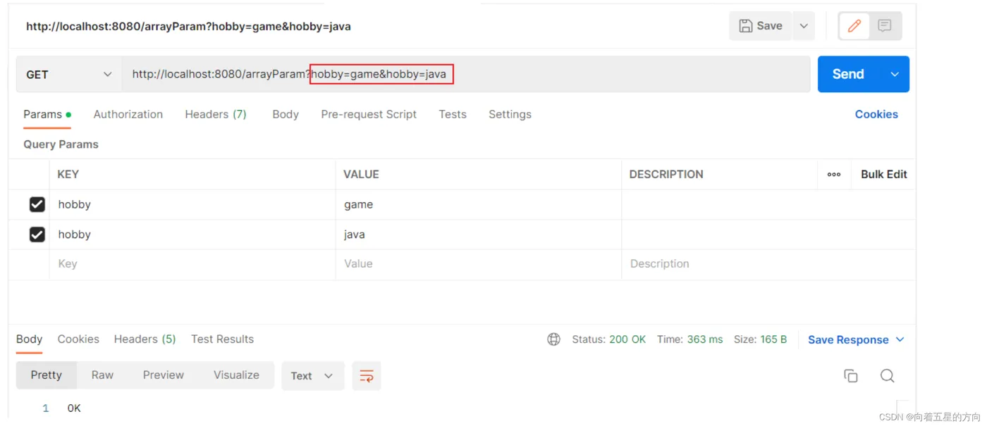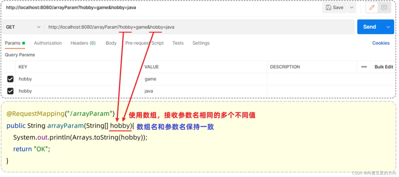 @RestController public class RequestController { //数组集合参数 @RequestMapping("/arrayParam") public String arrayParam(String[] hobby){ System.out.println(Arrays.toString(hobby)); return "OK"; } }