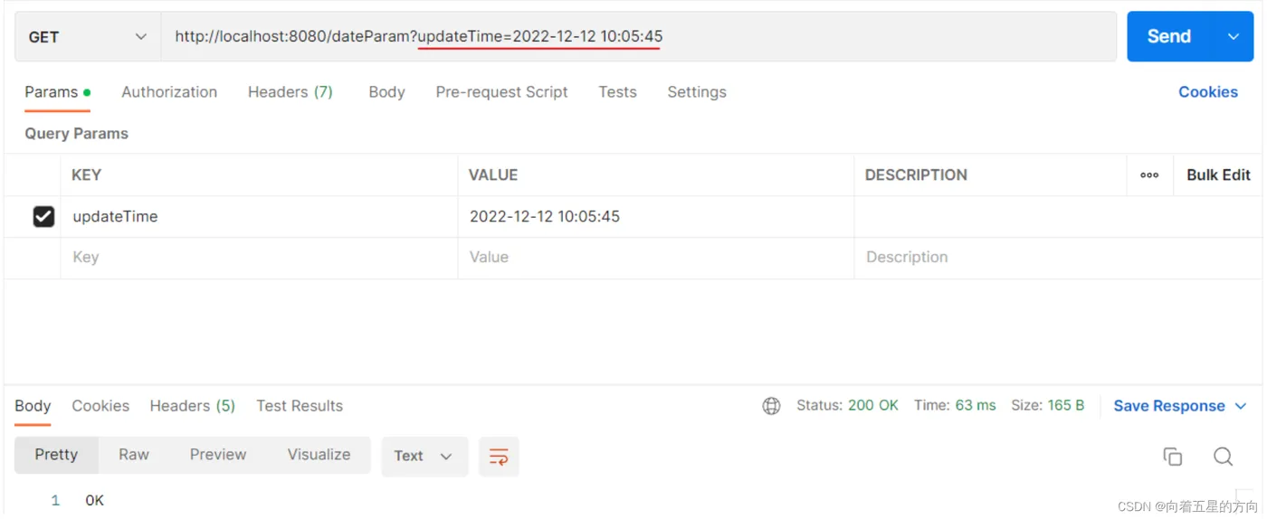 @RestController public class RequestController { //日期时间参数 @RequestMapping("/dateParam") public String dateParam(@DateTimeFormat(pattern = "yyyy-MM-dd HH:mm:ss") LocalDateTime updateTime){ System.out.println(updateTime); return "OK"; } }
