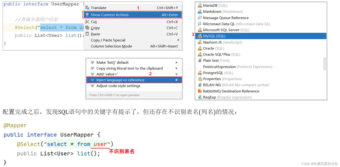 默认我们在UserMapper接口上的@Select注解中编写SQL语句是没有提示的。如果想让idea给出提示,可以做如下配置: