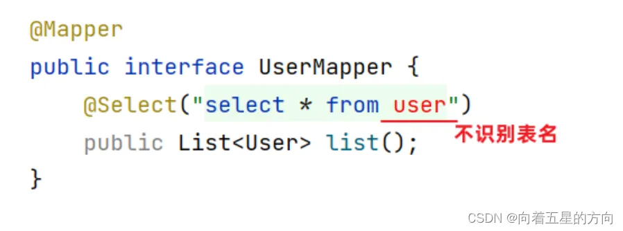 import com.itheima.pojo.User; import org.apache.ibatis.annotations.Mapper; import org.apache.ibatis.annotations.Select; import java.util.List; @Mapper public interface UserMapper { //查询所有用户数据 @Select("select id, name, age, gender, phone from user") public List<User> list(); }
