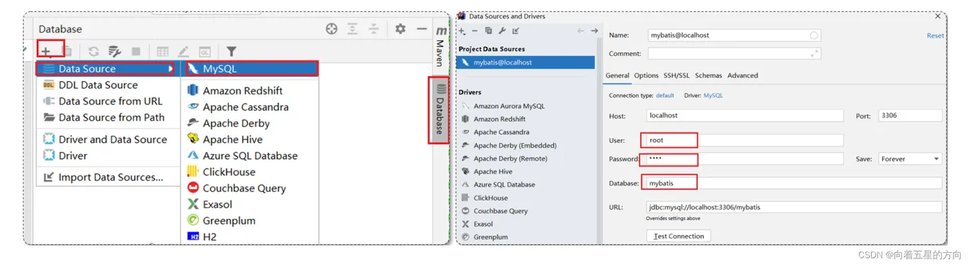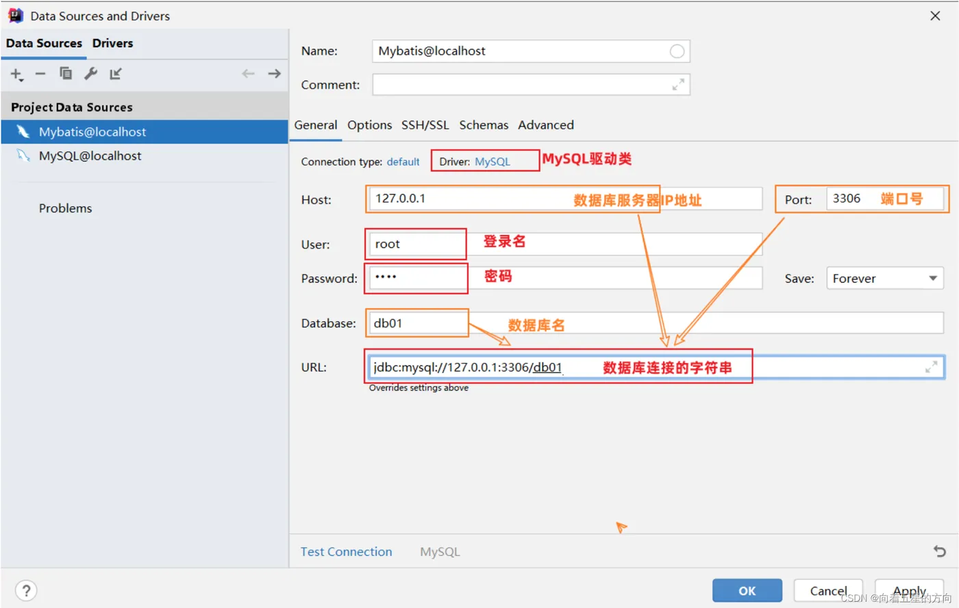 在配置的时候指定连接那个数据库,如上图所示连接的就是mybatis数据库。