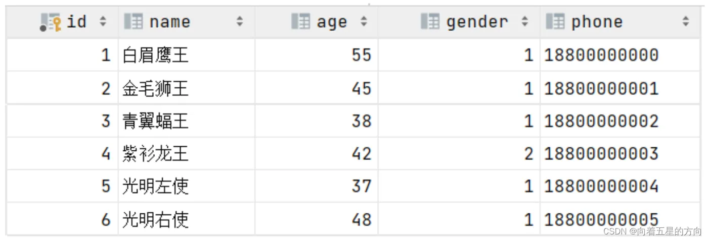 -- 用户表 create table user( id int unsigned primary key auto_increment comment 'ID', name varchar(100) comment '姓名', age tinyint unsigned comment '年龄', gender tinyint unsigned comment '性别, 1:男, 2:女', phone varchar(11) comment '手机号' ) comment '用户表'; -- 测试数据 insert into user(id, name, age, gender, phone) VALUES (null,'白眉鹰王',55,'1','18800000000'); insert into user(id, name, age, gender, phone) VALUES (null,'金毛狮王',45,'1','18800000001'); insert into user(id, name, age, gender, phone) VALUES (null,'青翼蝠王',38,'1','18800000002'); insert into user(id, name, age, gender, phone) VALUES (null,'紫衫龙王',42,'2','18800000003'); insert into user(id, name, age, gender, phone) VALUES (null,'光明左使',37,'1','18800000004'); insert into user(id, name, age, gender, phone) VALUES (null,'光明右使',48,'1','18800000005');