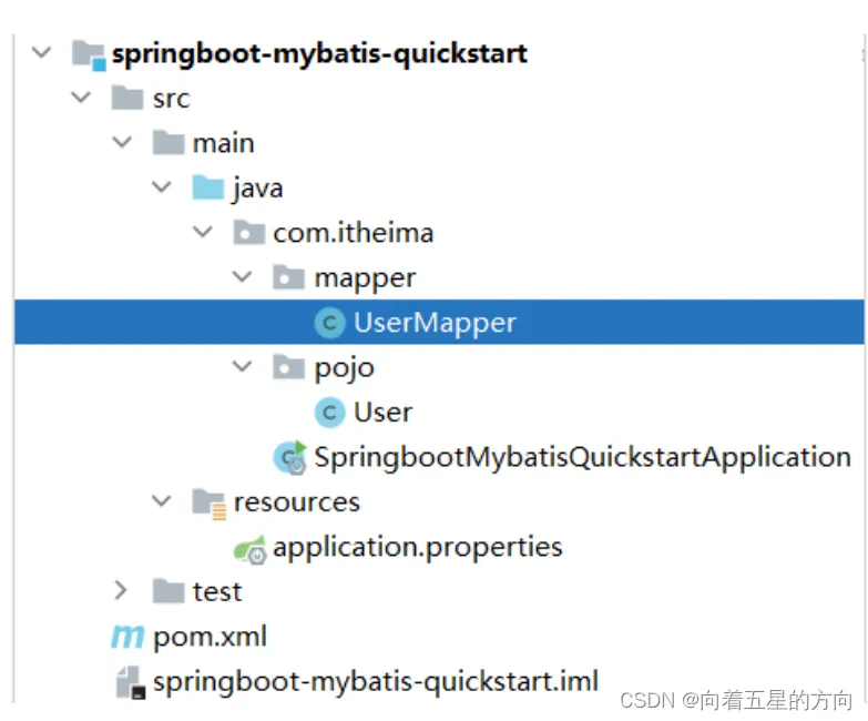 在创建出来的springboot工程中,在引导类所在包下,在创建一个包 mapper。在mapper包下创建一个接口 UserMapper ,这是一个持久层接口(Mybatis的持久层接口规范一般都叫 XxxMapper)。
