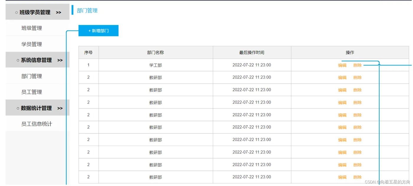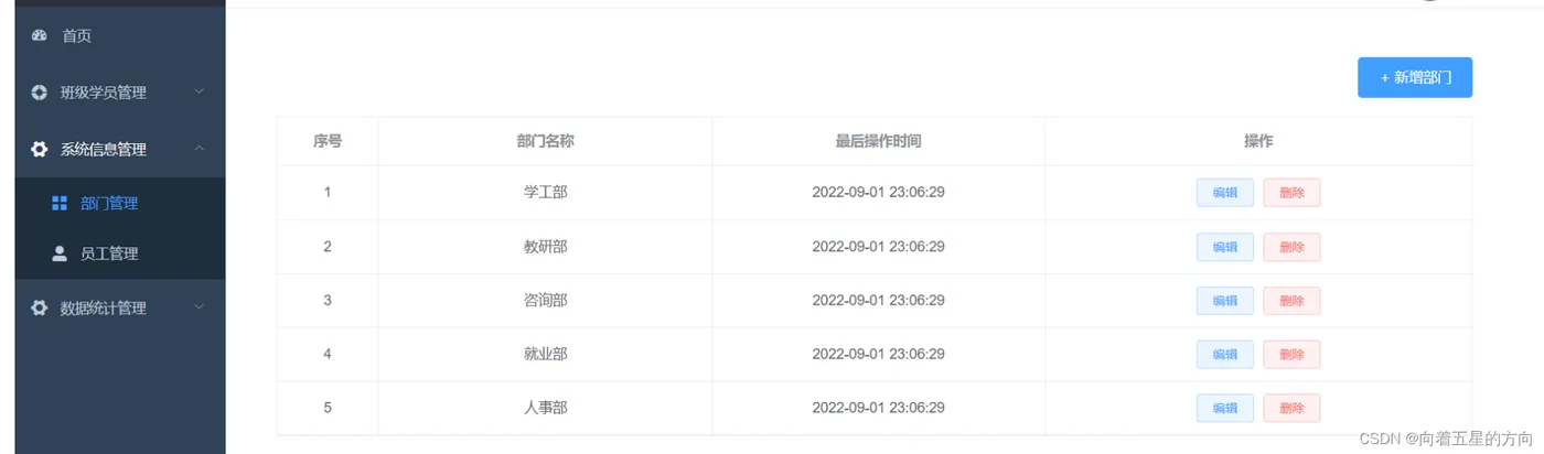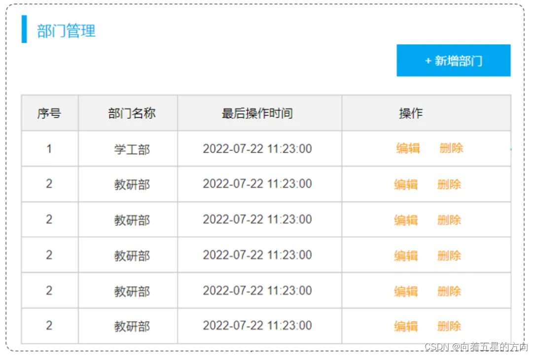 -- 部门管理 create table dept( id int unsigned primary key auto_increment comment '主键ID', name varchar(10) not null unique comment '部门名称', create_time datetime not null comment '创建时间', update_time datetime not null comment '修改时间' ) comment '部门表'; -- 部门表测试数据 insert into dept (id, name, create_time, update_time) values(1,'学工部',now(),now()),(2,'教研部',now(),now()),(3,'咨询部',now(),now()), (4,'就业部',now(),now()),(5,'人事部',now(),now());