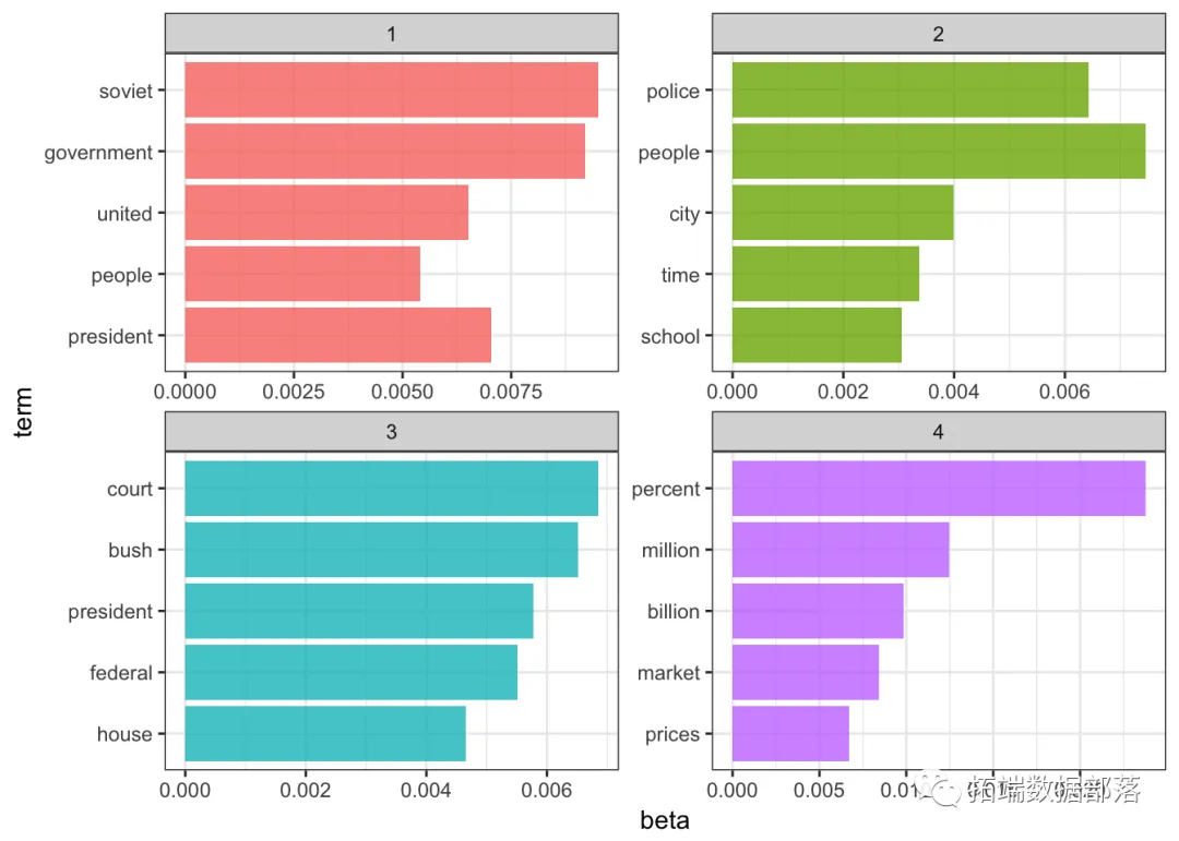 group_by(topic) %>% top_n(5, beta) %>% ungroup() %>% arrange(topic, -beta) top_terms ## # A tibble: 20 × 3 ## topic term beta ## <int> <chr> <dbl> ## 1 1 soviet 0.009502197 ## 2 1 government 0.009198486 ## 3 1 president 0.007046753 ## 4 1 united 0.006507324 ## 5 1 people 0.005402784 ## 6 2 people 0.007454587 ## 7 2 police 0.006433472 ## 8 2 city 0.003996852 ## 9 2 time 0.003369658 ## 10 2 school 0.003058213 ## 11 3 court 0.006850723 ## 12 3 bush 0.006510244 ## 13 3 president 0.005777216 ## 14 3 federal 0.005512805 ## 15 3 house 0.004657550 ## 16 4 percent 0.023766679 ## 17 4 million 0.012489935 ## 18 4 billion 0.009864418 ## 19 4 market 0.008402463 ## 20 4 prices 0.006693626 top_terms %>% ) + coord_flip()