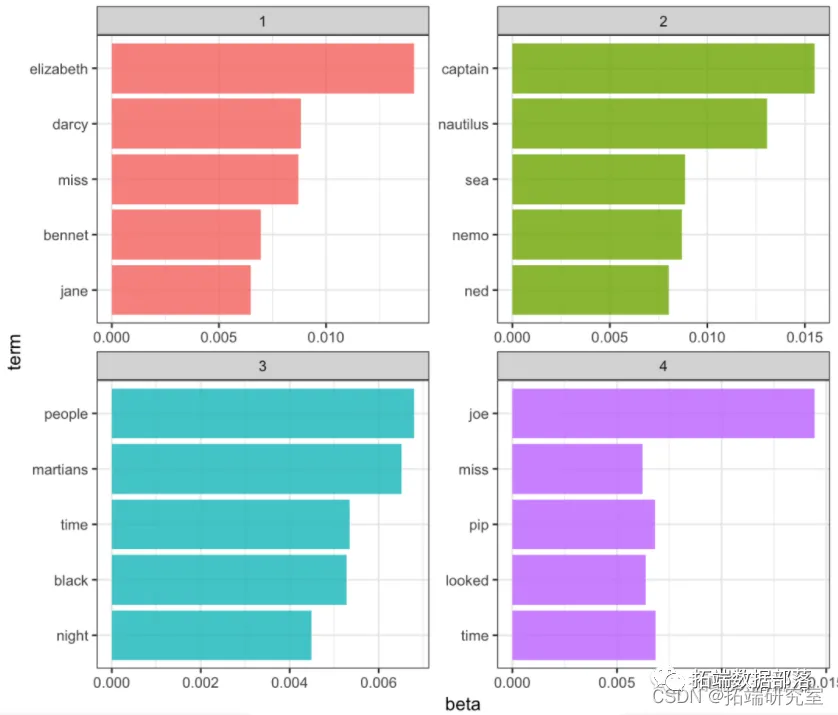 top_n(5, beta) %>% ungroup() %>% arrange(topic, -beta) top_terms ## # A tibble: 20 × 3 ## topic term beta ## <int> <chr> <dbl> ## 1 1 elizabeth 0.014107538 ## 2 1 darcy 0.008814258 ## 3 1 miss 0.008706741 ## 4 1 bennet 0.006947431 ## 5 1 jane 0.006497512
