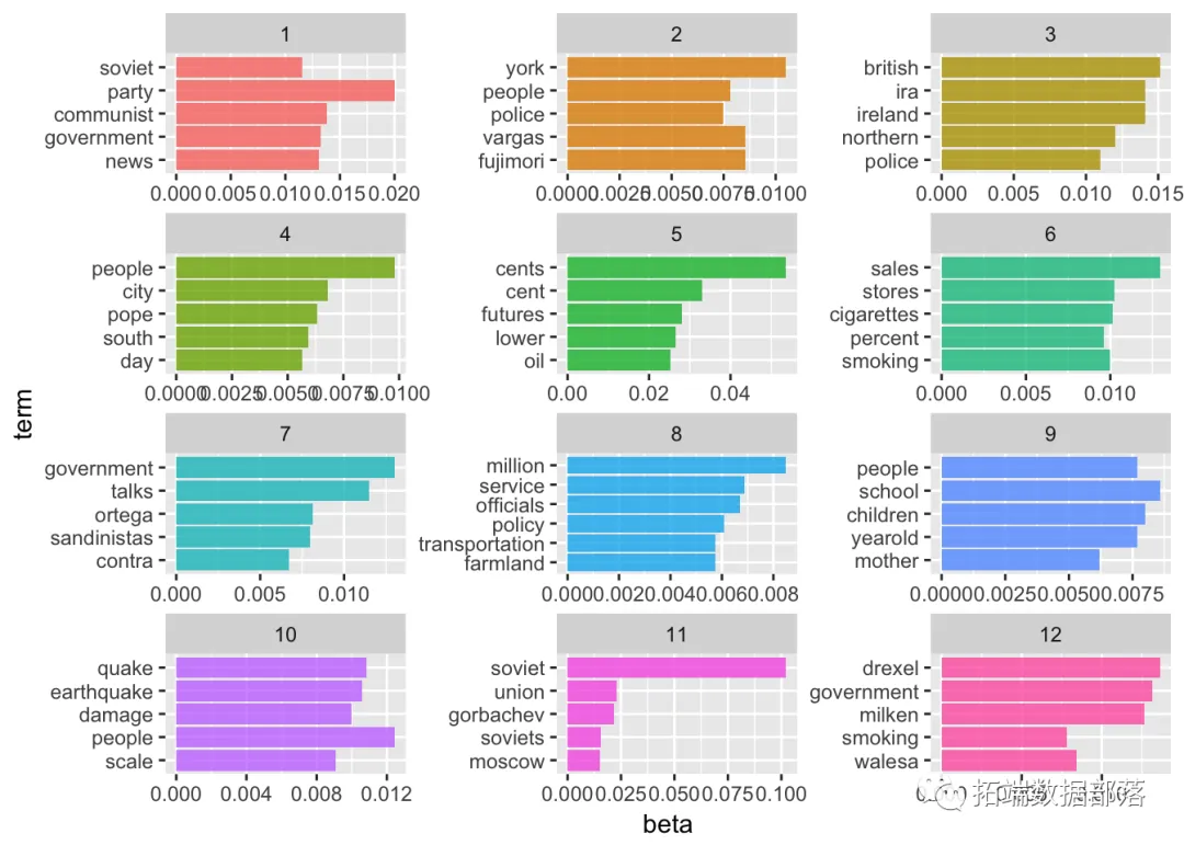 ap\_lda\_td <- tidy(ap\_lda\_compare\[\[6\]\]) top\_terms <- ap\_l ungroup() %>% arrange(topic, -beta) top_terms ## # A tibble: 502 × 3 ## topic term beta ## <int> <chr> <dbl> ## 1 1 party 0.020029039 ## 2 1 communist 0.013810107 ## 3 1 government 0.013221069 ## 4 1 news 0.013036980 ## 5 1 soviet 0.011512086 ggplot(aes(term, beta, fill = factor(topic))) + geom_bar(alpha = 0.8, stat = "identity", show.legend = FALSE) + facet_wrap(~ topic, scales = "free", ncol = 3) + coord_flip()